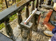 Создаём ограждение. Монтируем заранее вырезанные балясины, на них сверху приклеиваем гранитные балки. Получившееся ограждения имеет вид перил.